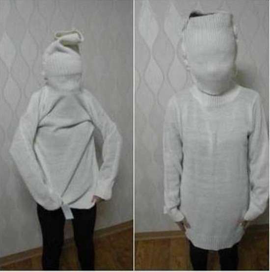 하지만 이 여성이 옷을 입으려고 노력에도 불구하고 목 부분이 너무 좁아 여성의 머리가 터틀넥을 통과하지 못하는 상황에 빠졌다.