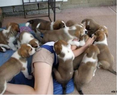 공개된 '강아지 떼 습격' 사진에는 한 여성이 귀여운 강아지 떼에게 둘러싸여 바닥에 뒹굴고 있다.
