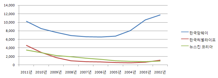 <한국암웨이 등 상위3개업체 매출변화 그래프>