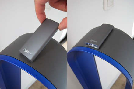 심지어 리모콘을 제공해 전원, 회전, 세기 모든 것을 조작할 수 있다. 리모콘은 자석으로 되어 있어, 사용하지 않을 경우 배출구 윗부분에 올려놓으면 고정이 된다. 다이슨의 센스와 유머가 돋보이는 부분이다.