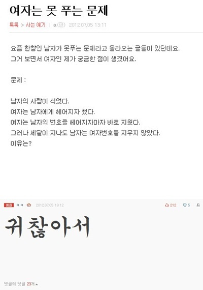 공개된 '여자는 못 푸는 문제'에는 "남자의 사랑이 식었다. 여자는 남자에게 헤어지자고 했다. 헤어지자마자 여자는 남자의 전화번호를 지웠다. 그러나 세 달이 지나도 남자는 여자의 전화번호를 지우지 않았다. 왜일까?"란 질문이 담겨 있다.