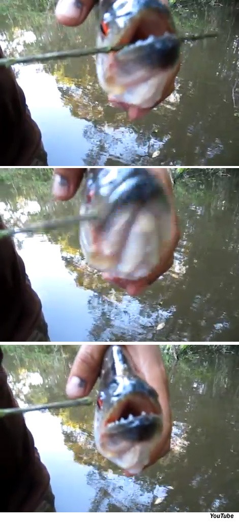 피라냐 이빨 위력 사진에서는 한 사람이 한 쪽에는 피라냐를 다른 한 쪽에는 나무 가지를 들고 이를 피라냐 입에 넣었다.