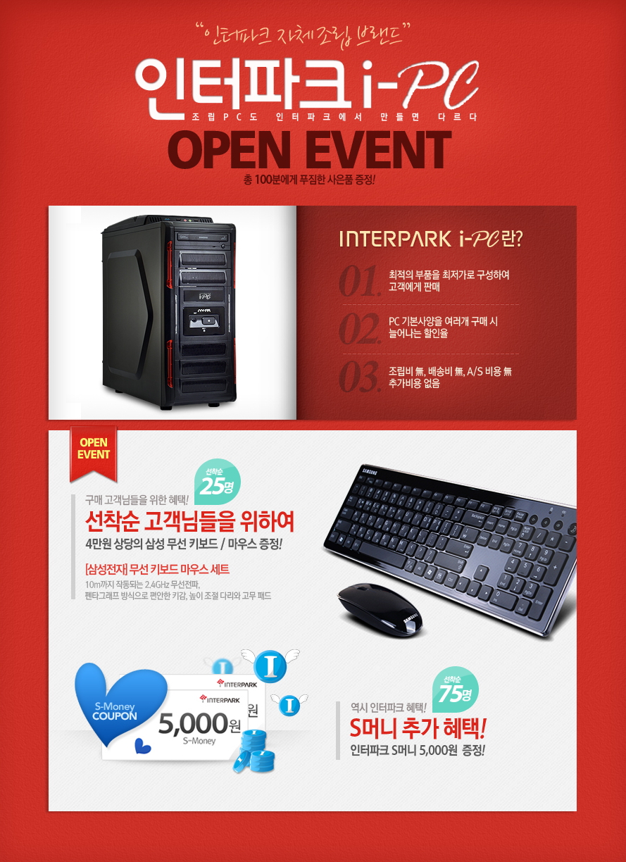 오픈 기념으로 구매고객 100명에게 선착순으로 삼성 무선키보드와 마우스 및 인터파크 S머니 5천원을 증정한다.