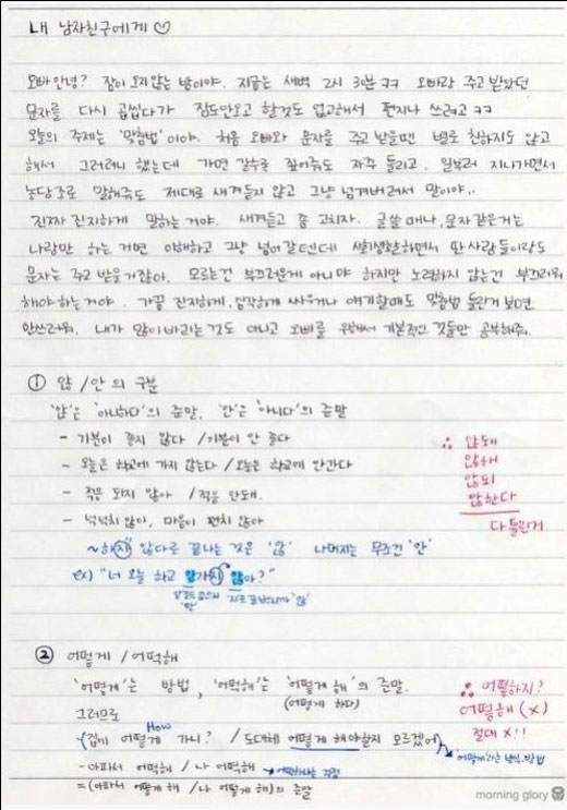 '여친이 국어 교사’라는 이 편지는 남자친구의 잘못된 맞춤법을 지적하는 내용이 담겨 있어 보는 이들의 시선을 끌었다.