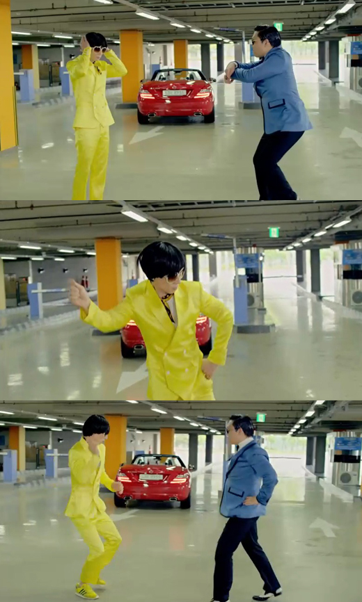 공개된 '강남스타일' 티저 영상에는 건물 주차장을 배경으로 가발과 선글라스를 쓰고 노란색 정장과 노란 운동화를 신은 유재석이 싸이와 댄스 배틀을 벌이는 장면이 담겨 있다.