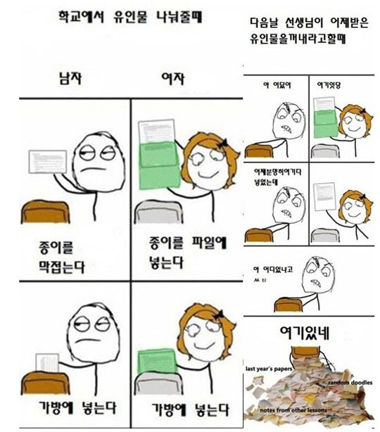 이 그림은 학교에서 유인물을 나눠준 뒤 다음날 선생님이 유인물을 꺼내라고 했을 때 남녀 학생의 서로 다른 반응을 나타냈다.