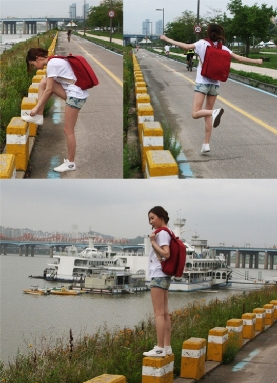 게재된 사진 속 간미연은 캐쥬얼한 흰 티와 핫팬츠에 빨간색 백팩을 메고 한강공원에서 산책을 즐기고 있다.