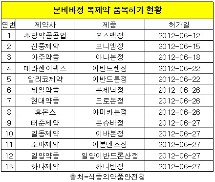 이를 위해 지난 6월 한 달간 식품의약품안전청으로부터 초당약품공업, 신풍제약, 아주약품 등 13개 제약사가 본비바 복제약의 품목허가를 받았다.