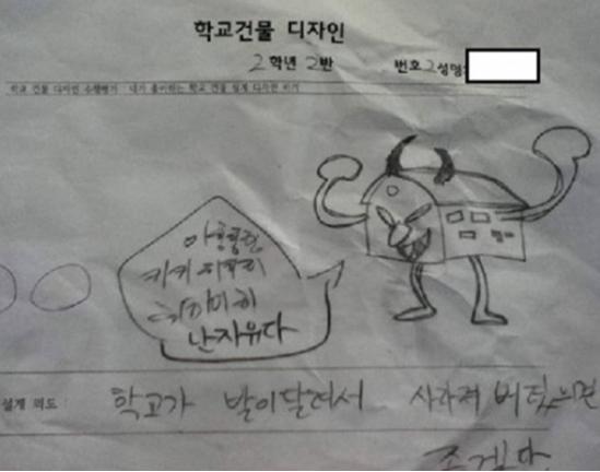 이는 초등학생이 '학교 건물 디자인하기'라는 숙제로 그린 그림이다. 그림을 보면 학교 건물에 팔과 발이 달려있고 뿔이 나 있다.