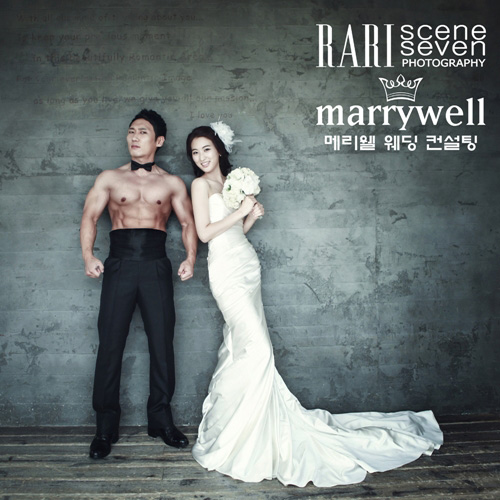 KBS <개그콘서트> 인기 코너 '헬스걸'의 트레이너로 활약해 많은 사랑을 받은 이승윤은 웨딩화보에서도 상반신을 탈의해 몸짱 신랑의 모습을 제대로 자랑했다.