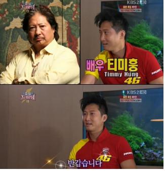 15일 방송된 KBS 2TV '출발드림팀 시즌2'에서는 '홍콩 국제 용선대회에 가다' 제 1탄이 공개된 가운데 배우 티미훙이 응원차 드림팀을 깜짝 방문해 눈길을 끌었다.