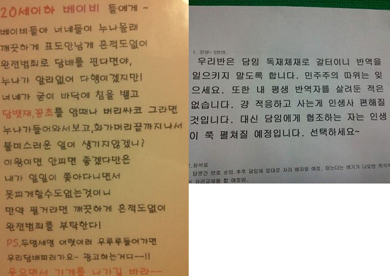 한편 최근에는 '담임선생님의 경고문' 게시물이 공개돼 인기를 끌기도 했다. 게시물에서 담임 선생님은 "우리반은 담임 독재체재로 갈터이니 반역을 일으키지 말도록 합니다. 민주주의 따위는 잊으세요"라며 하고 싶은 말을 처음부터 드러내 네티즌들의 폭소를 자아냈다.