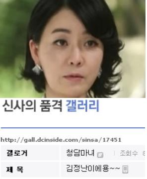 지난 15일 SBS 주말드라마 ‘신사의 품격’에서 ‘청담마녀’ 박민숙으로 열연 중인 김정난이 디시인사이드 ‘신사의 품격’ 갤러리에 ‘청담마녀’라는 닉네임으로 “김정난이에용~~”이라는 제목의 글을 게재해 네티즌들의 시선을 사로잡았다.