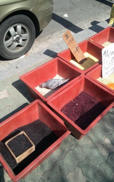 공개된 사진에는 비둘기 한 마리가 판매용 잡곡 상자 안에 들어가 있는 모습이 담겨 있다. 팥, 조, 콩 등 다양한 종류의 곡물 상자가 줄지어진 가운데 비둘기의 입장에서는 뷔페와 같다는 것.