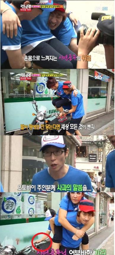 무거운 노사연의 무게에 지친 유재석과 이광수는 오토바이 위에 잠깐 노사연을 내려놓았다.