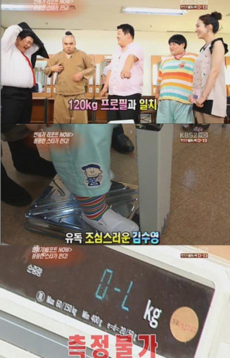 김수영 몸무게 측정 불가 소식에 누리꾼들은 "몸무게 얼마일까", "궁금하네", "김수영이 제일 뚱뚱하네"등의 반응을 보였다. (사진-KBS)