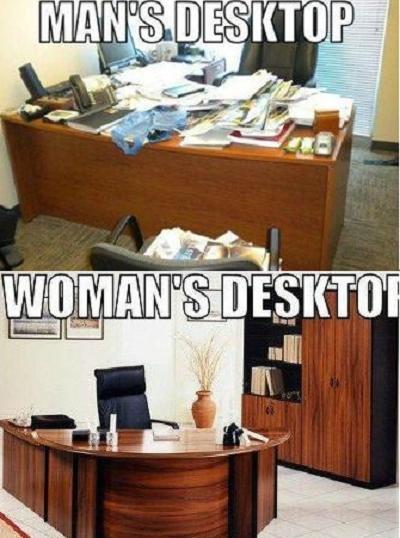 먼저 공개된 사진에는 남자 그리고 여자의 실제 책상이 찍혀있다. 남자의 책상은 잡다한 물건들로 굉장히 어지럽고, 지저분하다.