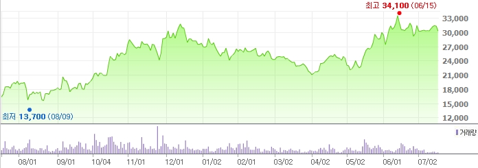지난 17일 영원무역 주가는 전 거래일 대비 3.19% 내린 3만350원으로 거래를 마쳤다. 5월경 2만원대 초중반까지 떨어졌던 주가가 지난 6월 이후 탄력을 받아 현재 3만원대에 안착한 상태다.