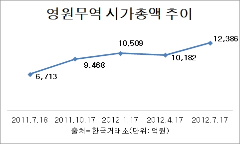 영원무역의 시가총액은 작년 7월 18일 6천713억원에서 올해 1월 17일 1조509억원으로 56.5% 늘더니 이달 17일 현재 1조2천386억원을 기록하면서 1년 만에 두 배 가까이 늘었다.
