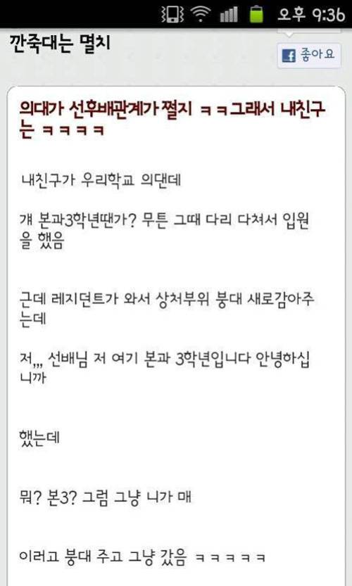 의대생이 다리를 다쳐 병원을 갔는데 환자가 자신의 후배임을 안 담당 레지던트는 "네가 직접 해"라며 붕대를 주고 가버렸다는 내용이 보는 이의 웃음을 자아낸다.