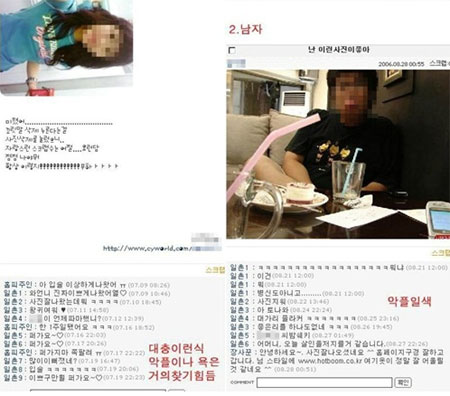 게시물 속 사진은 미니홈피에 게재된 남자와 여자의 사진 그리고 그 밑에 달린 댓글을 캡쳐한 것이다.