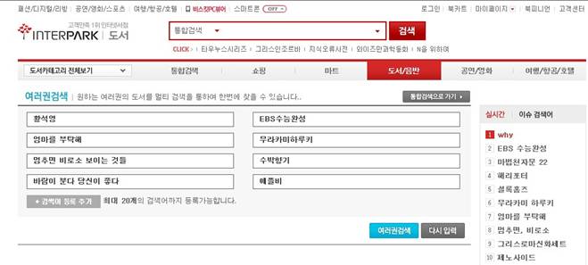 인터넷서점 ‘인터파크도서’가 소비자 편의를 위해 한번에 20권까지 책 제목을 검색할 수 있도록 홈페이지를 개편했다.
