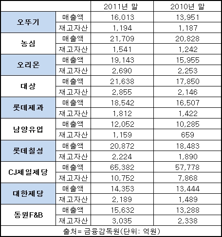 1위를 기록한 농심보다 매출액은 38.9% 적은 반면, 재고자산이 두 배 가량 많았다.