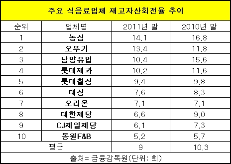 농심은 10대 식음료 업체 중에서는 지난해 재고자산회전율이 가장 높았지만, 2010년에 비하면 상대적으로 재고부담이 높아졌다.