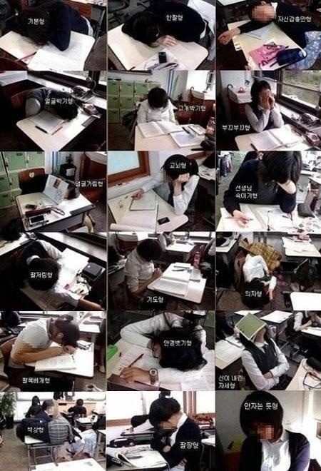이 게시물은 학교에서 학생들이 자는 유형을 총망라한 사진이다.