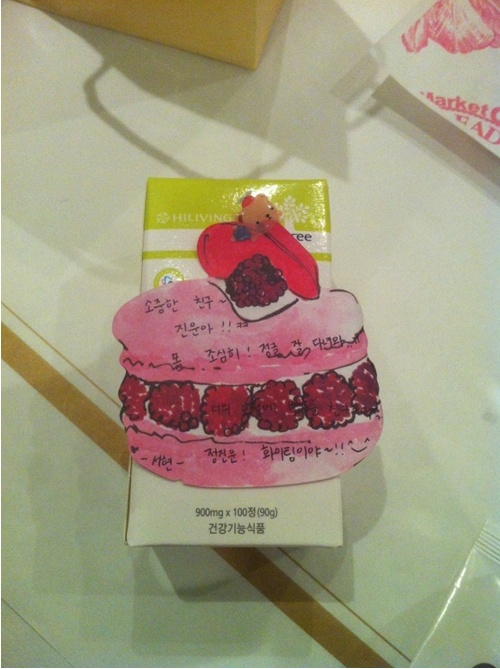 정진운은 19일 자신의 트위터에 "아 역시 친구가 최고입니다!"라는 글과 함께 한 장의 사진을 게재했다. 사진 속에는 서현이 직접 쓴 손편지와 함께 건강기능식품의 모습이 담겨있다.