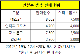 20일 온.오프대형서점에 따르면 안철수 서울대교수의 신간 ‘안철수의 생각’이 19일 12시 판매를 시작해 20일 오전 9시까지 24시간을 채우기도 전에 종전 일일 최고판매량을 기록한 ‘스티브잡스’의 판매량을 경신하고 있다.