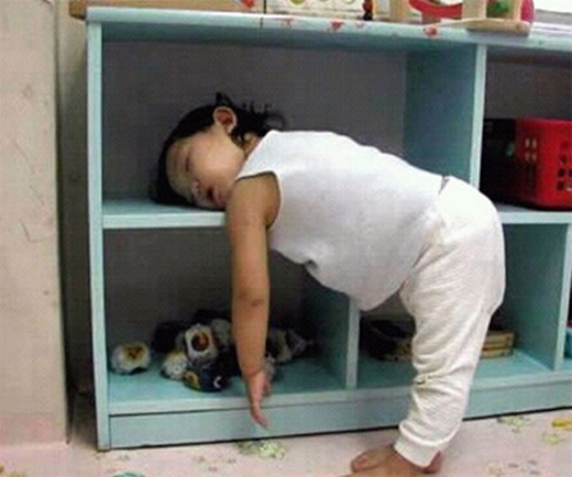 해당 사진을 보면 여자 아이가 침대가 아닌 장난감 수납장에 얼굴을 묻고 잠들어 있는 모습이 담겨 있다.