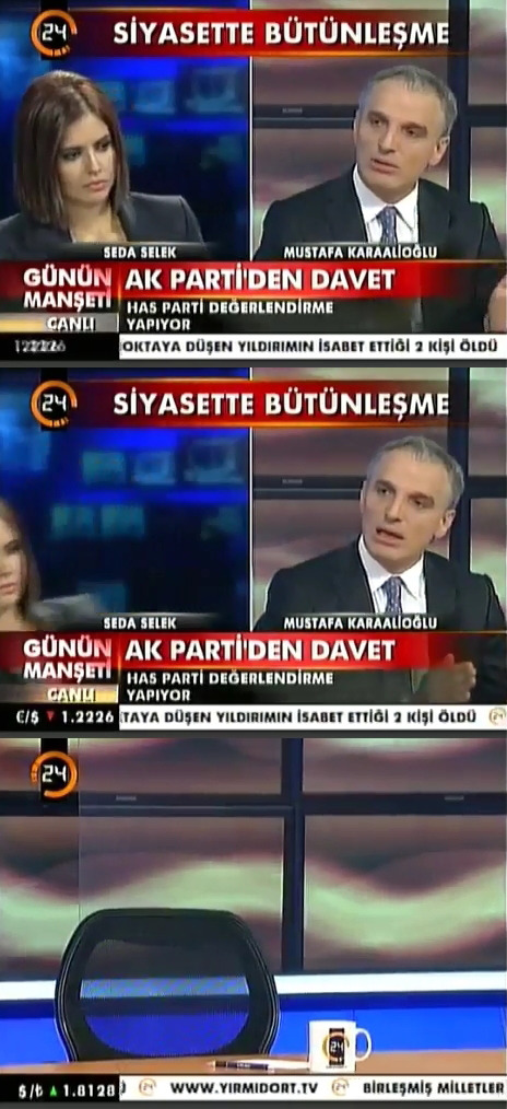 지난 19일(현지시간) 터키 뉴스프로그램 카날24(Kanal24)의 앵커 세다 세렉이 스튜디오에 출연한 한 전문가의 설명을 듣던 중 ‘쿵’ 소리를 내며 바닥에 쓰러졌다.