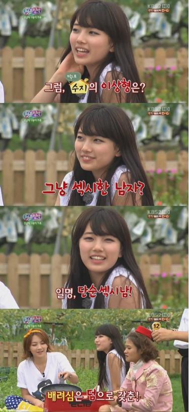 21일 방송된 KBS2TV ‘청춘불패2’에 출연한 수지는 “이상형이 누구냐?”는 질문에 “섹시한 남자”라고 답해 주위를 놀라게 했다.