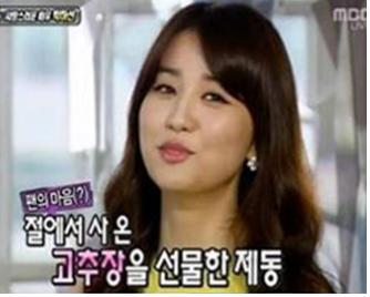 박하선은 “김제동에 대한 기사가 많이 나왔다”며“기사가 난 후 김제동과 개인적으로 만났다. 김제동이 절에서 사온 고추장을 선물해주더라. 교제제안은 있었지만 그냥 삼촌 조카 사이로 지내자고 했다”고 털어놨다. 이어 “밥 비벼먹을 때는 제동삼촌이 사온 고추장이 최고”라고 말해 웃음을 자아냈다. (사진-MBC)