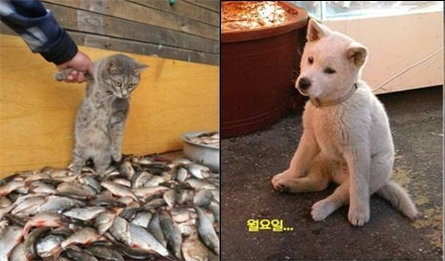 영혼이 빠져나간 고양이와 월요일을 맞은 강아지 게시물을 본 누리꾼들은 "생선 두고 끌려가야 하는 마음 완전 공감", "고양이 손 좀 놔주지", "이것이 바로 진정한 멘붕 표정~" 등의 반응을 보였다.(사진-온라인 커뮤니티)