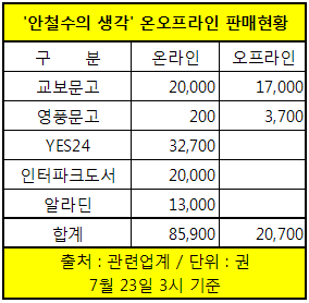 교보문고와 영풍문고의 오프라인 판매량을 합한 2만700권보다 1만2천권이 더 많다. 인터파크도서(2만권)와 알라딘(1만3천권)의 판매량까지 합하면 순수인터넷서점의 ‘안철수의 생각’ 판매량은 6만5천700권으로 교보, 영풍문고 등 대형 서점의 오프라인판매량에 비해 3배나 된다.