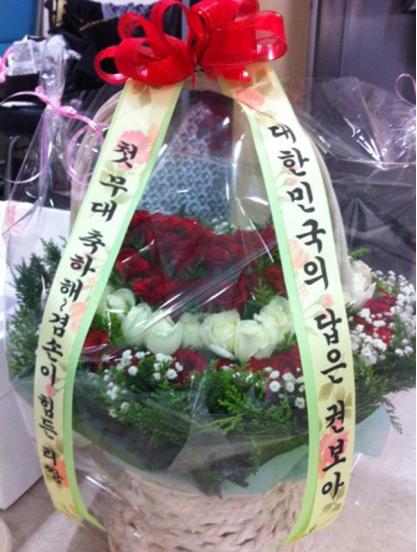 화환의 문구에는 "첫 무대 축하해. 겸손이 힘든 리쌍. 대한민국의 답은 권보아"라고 적혀있다.