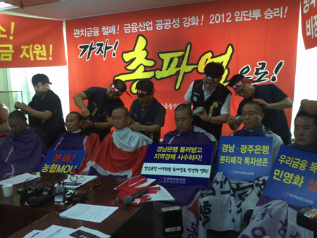 금융노조는 24일 서울 을지로 소재 노조 투쟁상황실에서 기자회견을 열고 "금융권 낙하산 인사를 통한 관치금융은 이제 끝내야 한다"며 30일 총파업 의지를 천명, 김문호 금융노조 위원장과 임혁 우리은행지부 위원장, 허권 농협중앙회지부 위원장 등 6명의 노조위원장 삭발식을 단행했다.