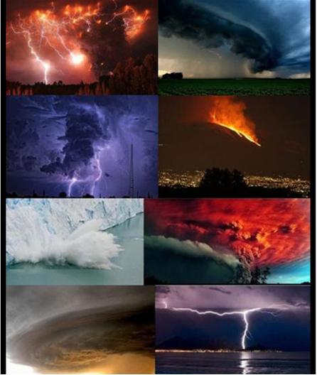 사진에는 하늘에 번개치는 모습, 산의 화산이 분출하는 모습과 토네이도 등의 모습이 담겨있다.