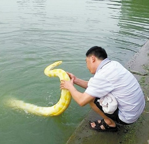 24일 중국경제망에 따르면 중국 장쑤성 창저우 시 한 호수에서 초대형 황금구렁이가 발견됐다.