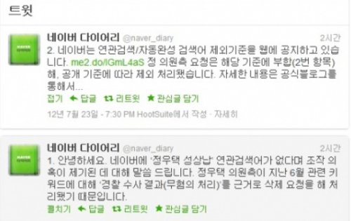 이에대해 네이버 측은 네이버 다이어리 트위터에서 "'정우택 성상납'연관 검색어가 없다며 조작 의혹이 제기된 데 말씀드린다. 정 의원 측이 지난6월 관련 키워드에 대해 무혐의 처리를 근거로 삭제 요청을 해 와 처리됐다"고 해명했다.