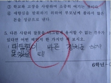 6학년의 답안지 사진은 한 초등학교 6학년 학생의 시험지 답안으로, '다른 사람의 잘못을 너그럽게 용서할 수 없는 경우가 있다면 어떤 때인지 한 가지만 써 보시오'라는 문제에 '대통령이 바른 정치를 하지 못 했을 때'란 답안을 적어넣은 것.