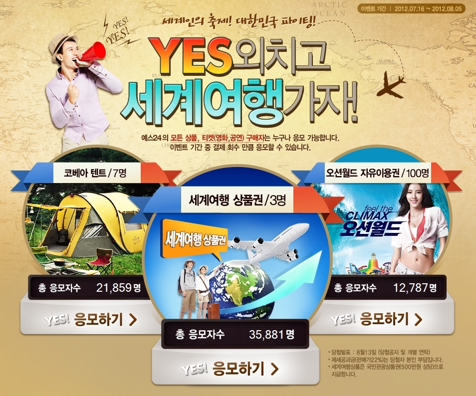 예스24는 오는 8월5일까지 자사 홈페이지를 통해 도서, 영화, 공연티켓을 구매한 모든 고객에게 500만원 상당의 세계여행 상품권 등을 얻을 수 있는 응모 기회를 제공한다고 밝혔다.