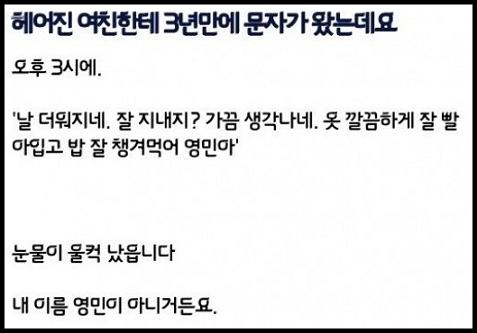 문자의 내용은 상당히 살갑다. 영민이라는 이름을 가진 전 남자친구에게 이 여자는 "밥 잘 챙겨먹고 옷 깔끔하게 잘 빨아입어라"라는 살가운 조언을 던진다.