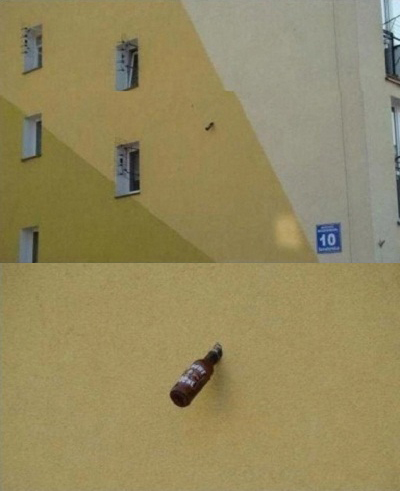 최근 온라인 커뮤니티에는 ‘술병의 패기’란 제목의 사진이 등장했다. 공개된 사진은 외국에서 촬영된 것으로 한 빌라 외벽에 무언가가 꽂혀 있다. 확대해 놓은 다른 사진을 보면 술병은 건물 벽을 뚫고 병 입구 부분만 박혀 있어 궁금증을 자아낸다.