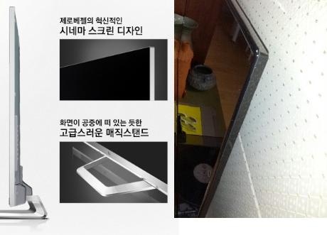 하지만 막상 제품을 받자 기대는 실망으로 바뀌었다. 광고에 나와 있는 TV 베젤(테두리) 부분이 실버 철제의 알루미늄인데 반해 배송된 제품은 검정색 플라스틱 베젤이었던 것.