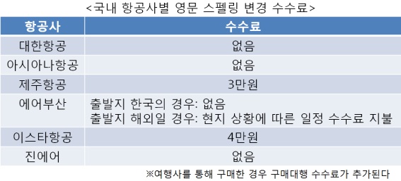 소비자가 만드는 신문에서 국내 항공사 6곳(대한항공, 아시아나항공, 제주항공, 에어부산, 이스타항공, 진에어)의 항공권 스펠링 정정 수수료를 조사한 결과 항공사별로 천차만별이었다.