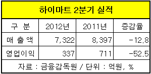 하이마트는 올 2분기에 매출(7천322억원)과 영업이익(337억원)이 전년동기 대비 각 12.8%, 52.5% 감소했다.