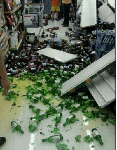 이 게시물에는 마트 진열장이 무너져 맥주와 소주병들이 바닥에 떨어져 깨져 있다.